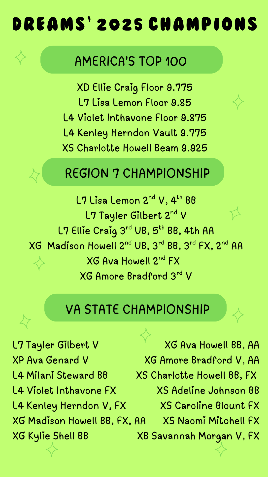 We look forward to helping your gymnast see what dreams are really made of. There is no dream that is ever too big!